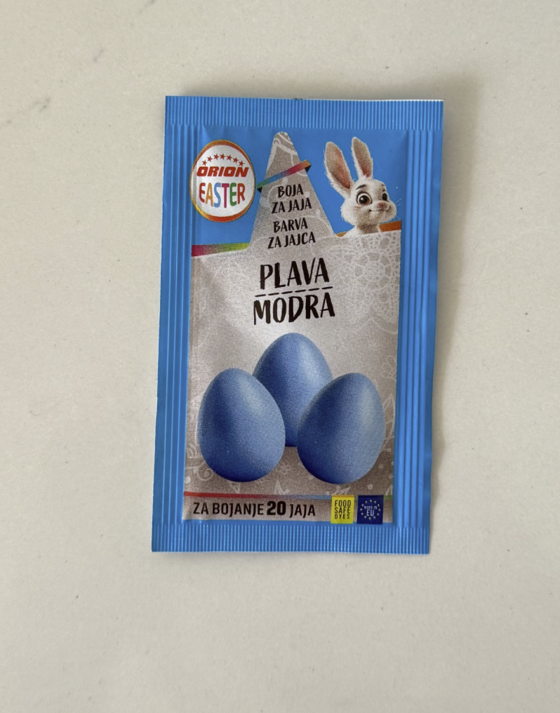 Barva v prahu za pirhe. Z eno vrečkico lahko pobarvate cca 20 jajc.